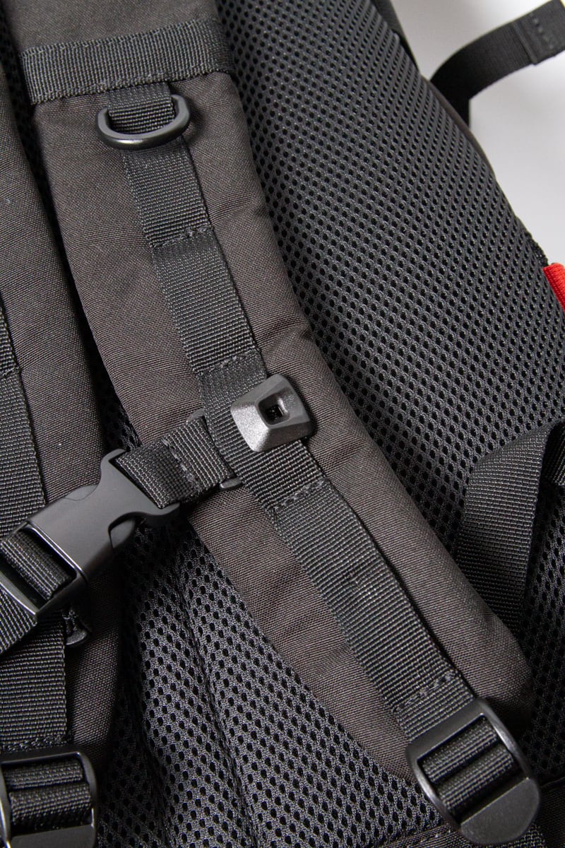 ・体への負担を軽減するチェストベルト付き。位置調整が可能で、自分好みのフィット感へ
