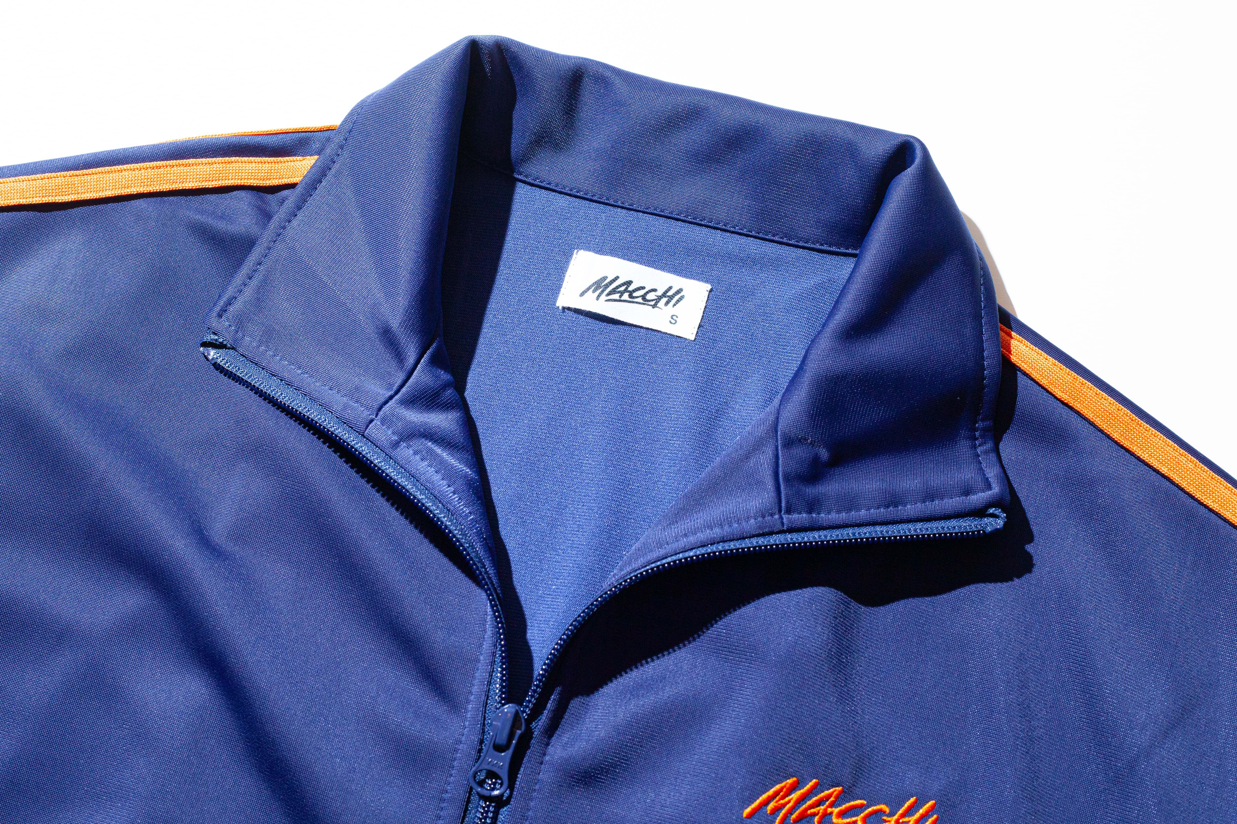 左胸にはワンポイントのロゴ刺繍、首元から袖にかけてのラインテープがアクセントとなるよう仕上げました。